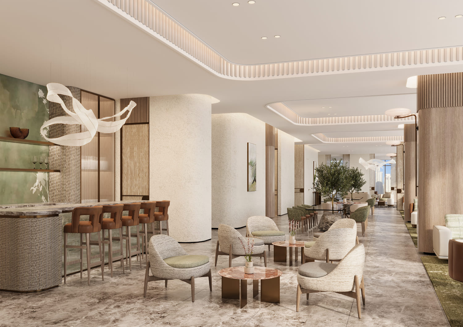 Projenin çatı katında bulunan geniş peyzajlı teras alanı, dinlenme köşeleri ve özel oturma alanları ile sakinlere şehir manzarası eşliğinde huzur dolu anlar sunarken, binanın alt katlarında yer alan 1.820 metrekarelik perakende alanı günlük yaşamı kolaylaştıran alışveriş ve hizmet noktalarına ev sahipliği yapıyor.